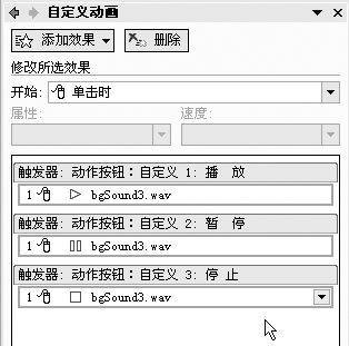 5.将声音停止控制设定为用停止按钮控制在自定义动画窗格中单击“添加效果/声音操作/停止”,然后操作方法如第4步,将触发对象设定为“停止”按钮。此时自定义动画窗格下方如图4所示。