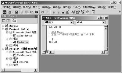 3.单击“工具”菜单→“宏” →“宏”,在弹出的宏对话框左边宏列表中选择A8B1,再单击“编辑”按钮,打开“Visual Basic 编辑器”,如图2;