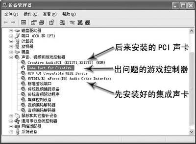 关闭机箱后,启动电脑,此时系统会提示找到新硬件,插入PCI声卡的驱动光盘后,根据提示安装好声卡驱动即可。注意,安装驱动时,声卡主驱动一般都不会出现问题,但由于系统中有了两个“游戏控制器”,因此在设备管理器中,后安装的这块PCI声卡的“Game Port for xxxx”会出现一个感叹号(图2)。