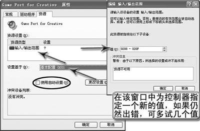 这时游戏控制器出现的问题只会造成该声卡的游戏接口无法工作,不过该接口一般很少使用,对声卡没什么影响。因此可以在其属性窗口中点击“资源”标签,然后点击“手动配置→更改设置”,将“使用自动设置”复选框中的钩去掉,接着点击“设置基于”的下拉菜单,选择“基于配置 0001”,最后双击“资源设置”窗口栏中出现错误的“输入/输出范围”,在弹出的“编辑 输入/输出范围”中,为该控制器指定一个新的值,最后保存设置并重新启动电脑即可(图3)。