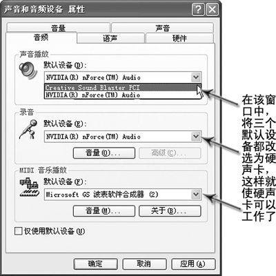 接下来,你就要为你的GF服务了:将耳机插入PCI硬声卡的“Line Out”插孔中(如果不是耳机而是音箱,其连接及使用方法也是一样的),在Windows中进入“控制面板→声音和音频设备”,等进入“声音和音频设备”属性窗口后,点击“音频”标签,将“声音播放”、“录音”、“MIDI 音乐播放”的默认设备由原来的集成声卡改选为PCI接口的硬声卡(图4)。