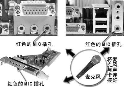 阿King提醒:如果用户有两块声卡,则只须将麦克风插在当前系统默认(也就是正在工作)的那块声卡的麦克风输入插孔中。对于那些没有用颜色来标示插孔功能的声卡,那么麦克风输入插孔旁边一般会印有一个麦克风的标志,或者印有“MIC”字样。