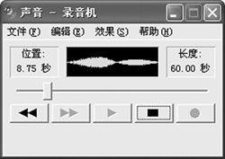 完成上述设置后就可以正式开始录音了。不过,录音需要录音软件才行,除了安装各种专业的录音软件外,我们可以先试试Windows自带的“录音机”:点击“开始→程序→附件→娱乐→录音机”,进入录音机窗口后,点击红色的录音按钮即可开始录音了,此时在软件的波形显示框中,可以看到实时的波形信号(图8)。