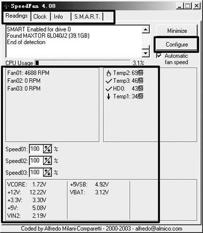 SpeedFan安装运行后将自动检测、读取主板的一些信息,如监控芯片的类型、硬盘型号、容量、系统总线及主板各项电压等。并且可以最小化在系统托盘中实时显示当前系统设备的温度。使用SpeedFan一般只要使用默认设置即可,但如想充分发挥它的威力,那就有必要对一些项目进行设置。从SpeedFan的主界面可见到“Readings(读取)”、“Clock(时钟)”、“Info(信息)”、“S.M.A.R.T.”四个选项卡(如图1),其中“读取”、“时钟”可用于对一些项目进行设置,而后两者则主要是读取、显示内存与硬盘S.M.A.R.T.有关参数。