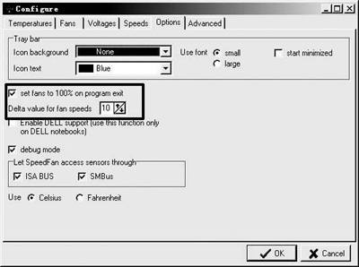 如想进行更为详细的设置,请点击“Configuer(设置)”进入相应设置对话框。此处包含了温度、风扇、电压、速度等众多可调整的项目。其中“Options(选项)”选项卡可自定义系统托盘图标的背景和文字色彩、大小,确定风扇访问传感器是通过何种系统总线进行等。这里有一项比较实用的功能──调整风扇转速,以达到增速加强降温或降速减噪的目的。如果你想自己手动调整风扇转速(默认是自动),可点击需调速风扇旁边的百分比值,SpeedFan就会按照默认的“风扇速度增量”(即以10%)来增减速度比值。0调整比值后你会感觉到风扇速度与噪音有变化(如图2)。