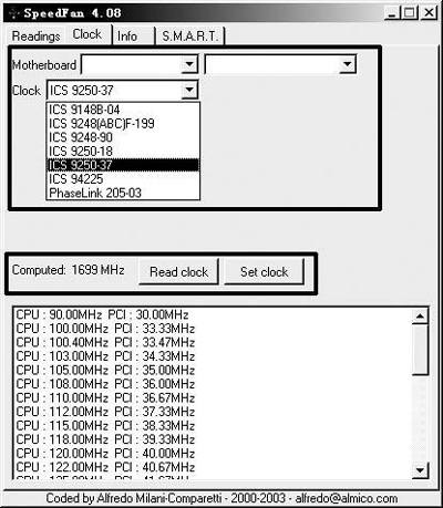 在确定主板(或时钟发生器)之后,下面的显示栏就会列出所支持的CPU外频、PCI总线、内存频率等信息。随后选择你需要的频率,通过点击“Set Clock(设置时钟)”和“Read Clock(读取时钟)”两个按钮,无须重启即能生效,达到超频的目的,超频后的频率将在“计算”处显示。注意:千万不能选错主板型号和时钟发生器,否则有可能损坏硬件设备。