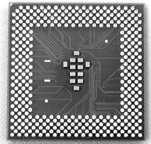 那么CPU核心是如何通过基板与整个系统的其他部分连接呢?那就是通过我们都很熟悉的数百根信号针脚插在插座上来实现的,此时基板起着内核心晶体管与外面电路的连接层的作用(作用如同主板、显卡的PCB板)。如果大家找一块最新版的AthlonXP 1700+(或Tualatin PⅢ,图5),仔细看就会发现基板上的走线。随着CPU越来越复杂,芯片的尺寸却越来越小,使得从内核引线并连接到针脚更加困难。现在CPU电路基板上这种上下贯穿的连线已经达到了10000多条,而今后这个数字甚至还会增加3到5倍,这对制作工艺将是一个不小的挑战。
