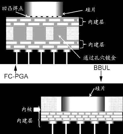 BBUL(Bumpless Build-Up Layer,也称“无凸块式增层”技术)是一种全新的半导体封装技术。如果采用传统的封装技术,微处理器内核与封装材料必须分别加以制造的,然后通过微细锡球(tiny solder balls)作为媒介焊接在一起,并从互连层部分引出信号传输针脚,然后再在外部封装的PCB板上进行布线处理,这样是一个非常复杂、细致的工作流程。而且这种处理器核心硅芯片所产生的信号必须通过一个相对长的过程(F/C焊点、核心层和互连层)才能够传递到外部封装的针脚上,再传递至电脑的其他部分上,整个过程寄生电感较大,大大限制了生产更高频率的CPU。