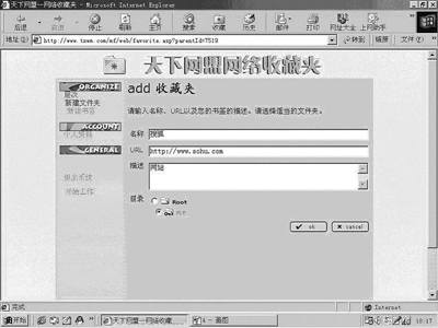 首先新建一个文件夹“网页”(也可用E文),然后再点击 “create new favorite”,在站点名称上填写“搜狐”,接着在URL上填写http://www.sohu.com,继而在站点描述中添加对“搜狐”的描述,最后点击“OK”即可(如图)。