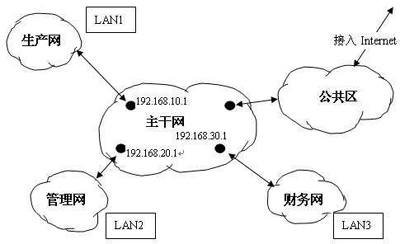 作为一个科技型企业,对内构建企业园区网,对外接入Internet,这两点在网络规划时都应考虑到。根据本单位的部门划分,企业电脑可分为以下三种类型:一是生产用电脑,二是管理用电脑,三是财务用电脑。在这三种类型中,基本上是部门内部交流较多,相互交流较少。经过分析,我们可将企业局域网按应用类型分为对应的三个子网:生产子网(LAN1);管理子网(LAN2);财务子网(LAN3)。这三者连接起来构成了企业的主干网。至于接入Internet部分本文不作介绍,仅介绍企业主干网部分的构建。