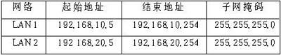 网络规划如下:LAN1网段为192.168.10.1~192.168. 10.254,LAN2网段为192.168.20.1~192.168.20.254,LAN3网段为192.168.30.1~192.168.30.254。每个网段的第一个地址用作网关,紧接着的两个地址留作其他用途,从地址4开始分配给服务器和工作站。网络规划见附表。