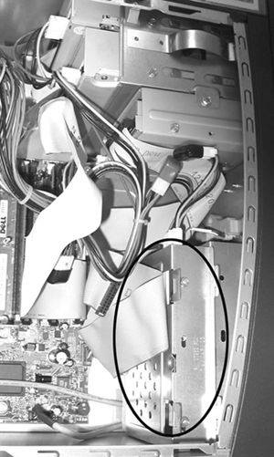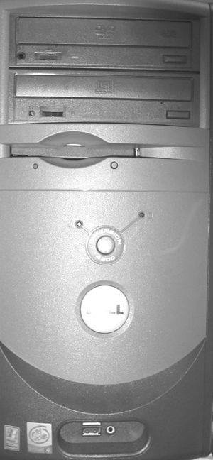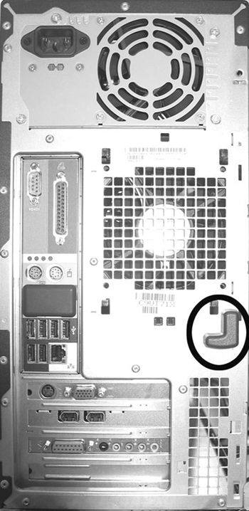 从外观上看,该型号的电脑机箱为深黑色与灰色相结合。机箱面板上有一个电源按键,没有reset重启键(与DELL DIMENSION 4550相似)。也符合目前大多数品牌机箱的设计惯例。机箱面板上有两个光驱槽,上面分别安装了一台CD-R/RW光驱与一台DVD-ROM光驱。可以让光驱各自分工,减缓激光头的老化(相对于COMBO光驱而言)。往下看,是DELL的品牌标志,在机箱正面的最下部,是两个USB接口与一个音频线接口。前置的USB接口可以让使用者方便地使用目前流行的带USB接口的数码设备(图1)。往机箱后面看,发现机箱结构与DELL DIMENSION 4550相比,有了很大改变。最显眼的就是这款机箱的开机方式,在机箱的后部,有一个曲尺型的部件(图2)。将它轻轻往下扳,然后用另一只手可以很轻易地将机箱侧面的挡板取下来。它与DELL DIMENSION 4550机型的设计虽然不同,但一样达到了简单开机箱的目的。