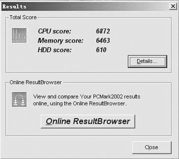 在这部分测试中,测试的是机器的CPU、内存、硬盘性能(这三个因素互相制约),其中,CPU部分的成绩为6872,内存部分的成绩为6463,而硬盘部分的成绩为610(图4)。由于选用的各个配件都属于中、高端,因此得到这样高分,也是理所当然的事。