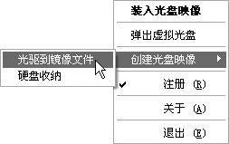 将要虚拟的光盘插入物理光驱中,然后左键单击该图标,会弹出一个菜单来(图2),选择“创建光盘镜像”下的“光驱到镜像文件” 命令即会出现“创建DVD/CDROM光盘镜像文件”对话框(图3)。