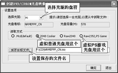 首先选择光驱的盘符,当然应该是光盘插入的那个驱动器,选择好后会显示出光盘的卷标和容量。接下来设置读取方式,默认的是Mcd格式,这是碟中碟专用的光盘镜像格式,不过它的通用性不如ISO格式,普通的光盘建议选择“2048 Cooker”单选框,后面的两种Raw读取方式,实际就是对光盘进行整盘复制,这是最能体现碟中碟强大功能的地方。用这两种方式来对付加了密的光盘和音乐CD非常有效。如果是PS游戏光盘,则必须选择Raw2352,用这种方式读取一些特殊格式的光盘速度快而准确,最后制作出的光盘镜像文件自然是最接近真实的光盘啦。最后单击“保存目标文件”按钮设置保存的位置及文件名,选择“确定”后即可开始制作光盘镜像文件。