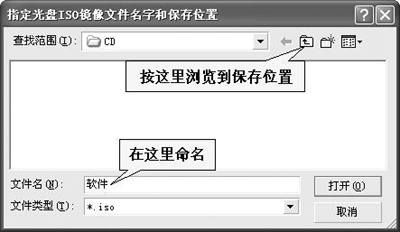 另外,你也可将硬盘中的某个目录制作成光盘镜像文件,在弹出菜单中选择“创建光盘镜像”下的“硬盘收纳”命令,会弹出“指定光盘ISO镜像文件名字和保存位置”对话框(图4),设置好了镜像文件的位置及名称后,单击“打开”命令,然后确认创建该镜像文件,并在其后的文件目录结构对话框(图5)中选择硬盘中的某个目录,点击“确定”后即可开始制作光盘镜像文件。通常将硬盘中的文件制作为镜像文件多是为了进行备份。