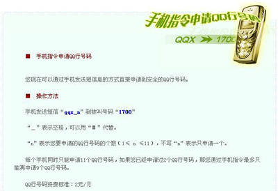 登录到腾讯首页(http://www.tencent.com),然后点击页面上方导航条中的“号码服务”,在弹出的新页面中,可以通过多种方式申请QQ号。点击“我想使用手机发送短信息申请QQ行号码”右侧的“申请”按钮(图1),这里笔者以此为例。在弹出的新页面中可以看到详细的操作说明(图2),这里不再赘述。