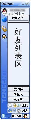 腾讯QQ 2003的主界面如图5所示。界面最上方是标题栏,右边有两个小按钮,第一个“-”按钮是将界面最小化,第二个“×”按钮则是用于关闭QQ程序。