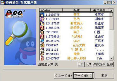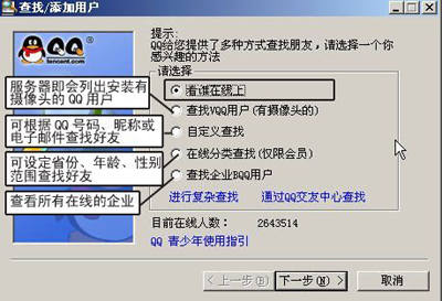 点击QQ主界面中的“查找”按钮,在弹出的“查找/添加用户”窗口中,有多种方式可查找朋友(图10)。选取“看谁在线上”,然后点击“下一步”按钮,在弹出的“查询结果:在线用户数”(图11)对话框中,选中一位好友,按下“下一步”即可将他添加为好友,他的头像会出现在QQ好友列表中。