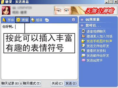 有没想过给好友发送例如你的照片一类的文件?单击好友列表中的Q友头像,在弹出的选项菜单中选择“传送文件”,选择好文件后按下“发送”按钮即可。