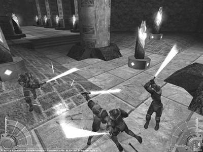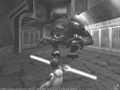 星战迷都知道,设计制造自己的光剑是每个杰迪学徒的必修课程。从剑柄式样到剑刃颜色,同样有多种方案供玩家选择。并且,随着游戏的进行,当玩家学会新的光剑格斗技能后,还会有适合这种光剑格斗技能的新的光剑式样可供选择,如达斯魔在电影前传I中一战成名所用的双刃光剑,或是像阿纳金在对战杜库伯爵时那样双手各持一把光剑。《杰迪武士Ⅲ》中的光剑格斗比前作更为流畅,招式更加丰富。但令人遗憾的是,游戏仍然未采用官方设定的光剑七式,而是简单地将攻击模式分为快速、中速、重击。当然,这也是因为用键盘的确很难操作出复杂的剑术,游戏不得不将之简化了。使用不同的光剑,配合以不同的攻击方式。若是用单剑,玩家可以用空出的手使用“原力牵引”将敌人抓过来,然后一剑重砍,还可以像达斯维达在电影中那样将光剑抛掷出去击敌。用双刃剑,最适合与大批敌人混战,在敌群中旋风似地横挑竖劈,敌人瞬间躺倒一大片,爽!(天哪,我怎么越说越邪恶,看来我应该当一名嗜血的西斯武士。)虽然电影中的杰迪武士只用光剑,但游戏中仍然提供了不少的常规武器,毕竟在对付远程敌人时,枪还是比光剑好用的。原力技能也比前作有所增加,但游戏制作商尚未透露有哪些新增技能。
