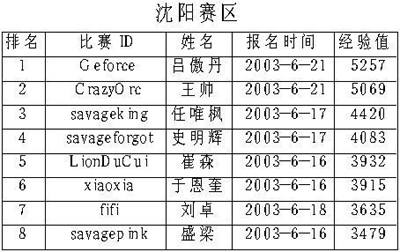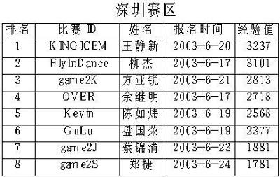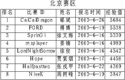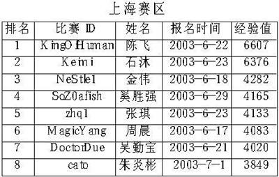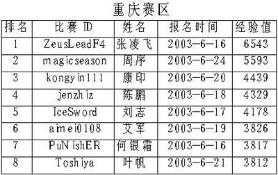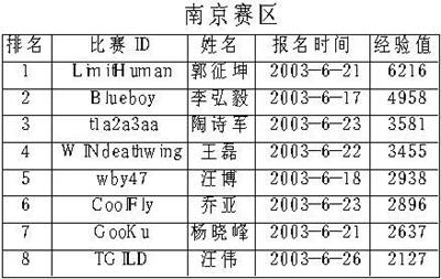 下面是各个分赛区前8名选手名单(截至到7月10日)。虽然在目前排名各个赛区前8名的选手都有可能进入最后的总决赛,但实际上根据我们的记者报道,很多玩家都因为各种原因故意隐藏实力。除了我们在上期曾经介绍过的各位参赛高手外,像以前在星际界鼎鼎大名的MTY、CQ2000、单挑王子等人也都启用了他们的魔兽比赛专用ID来进行比赛。在这种情况下,本次比赛的复赛相信一定会更加精彩纷呈、冷门迭爆。