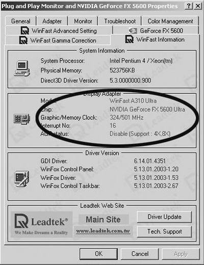 为了验证这位读者的说法,我们在市场中以1550元的价格购得一块丽台A310TD显卡,拆开排列在显卡背面的显存上的散热片,我们发现显存果然是使用的三星4ns DDR,理论上显存频率只能达到500MHz,不能达到550MHz。同时,我们也发现,丽台A310TD显卡在包装以及说明书上,并没有指出它使用显存的规格,同时使用它自带软件查看核心/显存频率为324/501MHz。