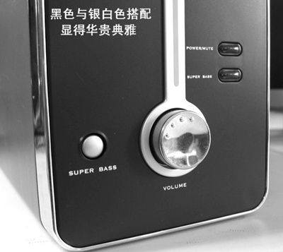 该套装音响部分为2.1组合,一个低音放大单元和两个小音箱。低音放大单元的气流倒相孔和音量旋钮旁绕着一条银白色的花边,配合上黑色的面板和银白色的按钮,显得时尚而华贵。另外,面板上还有电源和重低音(Super Bass)指示灯,在重低音开启时,指示灯会发出炫目的蓝光,很是好看(图3)。