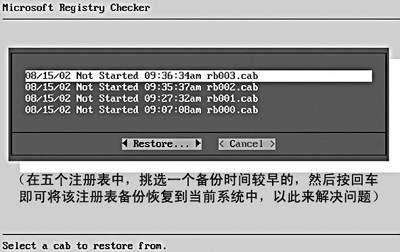 (2)进入“Command”目录后,输入“scanreg /restore”并回车便可启动“Scanreg.exe”的注册表恢复功能──它会自动找到其最近备份的5个注册表文件,并以时间为序来进行排列,用户通过上下方向键将光标定位到某个注册表备份文件之后(图2)。