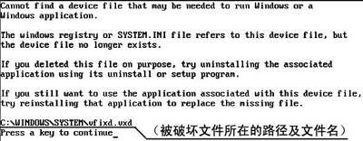 Win9X系统是一种比较容易崩溃的系统,当系统中的重要系统文件被破坏后,往往会导致系统无法启动。其中最常见的故障就是“VxD”文件丢失或遭到破坏所导致的无法启动。Win9X启动时需要载入虚拟装置驱动程序(VxD),如果被破坏的VxD文件不是核心文件,则系统还能正常启动,只是会提示某某VxD文件出错。万一是核心VxD文件,则系统就会无法启动,同时还会提示丢失了哪些VxD文件(图3)。