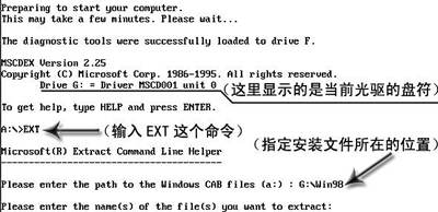 对于这种启动故障,利用“EXT”即可解决问题:“EXT”是一个用于从CAB压缩包中释放系统文件的实用程序,“EXT”命令具有从安装盘的所有CAB压缩包中自动搜索用户所需系统文件的功能。