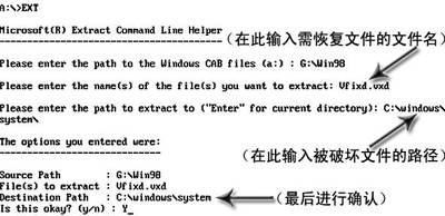 (3)接着“EXT”会询问用户需要提取哪些文件(支持通配符),在此根据启动时的错误提示信息输入需要恢复的系统文件的文件名,如“Vfixd.vxd”。