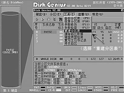 将Disk Genius拷贝到一张干净的启动软盘中,通过启动盘进入DOS后,运行“DiskGen”即可进入程序主界面:按“Alt+T”组合键,弹出“工具”菜单,通过上下键选中“重建分区表”后按回车(图8)。