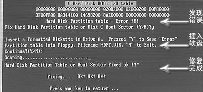 这段话的中文大意是:请插入一张软盘,以便将坏的引导区信息做一备份,其文件命名为HDPT.VIR。放入软盘按Y键继续,按N键退出。