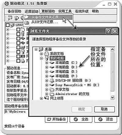 当重装好Windows之后,在没有安装好驱动的情况下,先安装好驱动精灵,然后执行该软件,并点击主界面上的“还原驱动→从备份文件夹还原”,然后在弹出的浏览文件夹窗口中,找到那个存放驱动备份的文件夹(图12)。
