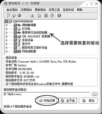确认之后,当返回到主界面时,驱动信息栏中所显示的就是所有备份好的驱动信息,如果要恢复所有驱动,则点击“全选”按钮,然后点击“开始还原”按钮(图13)。