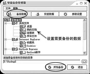 选中需要备份的选项,然后设置好备份资料的存放目录,再点击“开始备份”并确认操作即可。