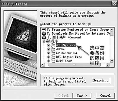 在弹出“Backup Wizard”窗口后,在程序选择窗口中选中需要备份的某个已经安装在当前系统中的应用程序(图16)。