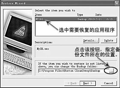 在重装Windows之后,安装好Norton CleanSweep,启动并进入其主界面之后,点击“Programs→Restore Wizard”,在弹出的“Restore Wizard”窗口中,点击“Backup Folder”栏后面的“…”按钮,找到先前备份好的那个应用软件的备份文件,此时在程序恢复窗口中便可看到该软件了(图17)。