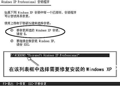 用光标选中系统中这个已经损坏的Windows XP,然后按R键进行修复安装,最后根据提示完成操作。
