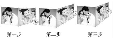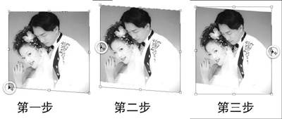 2.将第一幅照片拖到新建的文件当中,我们将这张照片作为立方体的正面。按键盘上的“Ctrl+T”键,按照图3的方法进行操作。第一步:按住键盘上的Ctrl键,用鼠标按住左下的一个节点向上移动一点距离,注意要垂直移动;第二步:按住左边当中的节点,向上移动一点。第三步:按住右边当中的节点,向左移动一点,最后在控制区内双击鼠标,结束。