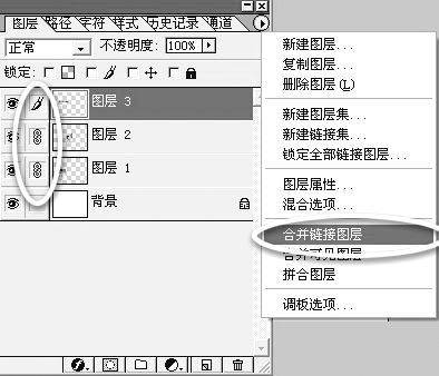5.在图层面板中,分别将图层1、图层2、图层3链接(在每个图层显示图表眼睛的后面一个),链接后的图层有一个链接条的显示。然后点图层面板最右上角的倒三角形,在下拉菜单中选“合并链接图层”(图6)。在弹出的对话框中点“确定”。现在3个图片层就合并为一个图层了。