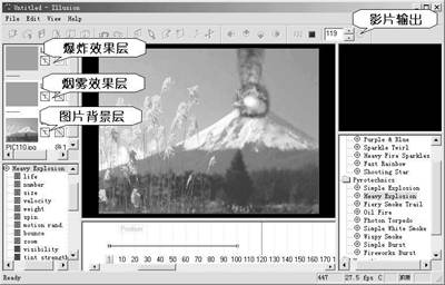 4.现在我们准备在这个新图层上添加粒子特效了,主窗口的右下方的子窗口里列出了系统内置的几十种特效,我们选择“Pyrotechnics”大类里的“Simple WhiteSmoke”子项,就会在预览窗口看到效果了。我们把光标移到雪山山顶的中央按下鼠标左键,出现的那个白色的圆圈就是烟雾的发射中心,按下工具栏的预览钮,青烟就从山口升起来了。