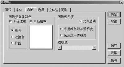 第二步:在“画刷”选项卡中可以对文字填充、透明度等属性进行设定,其中文字的填充方式有三种:单色、过渡色和位图,选定每项后,均可在右边的调色板中作进一步设置。图2是对过渡色设定的窗口,可在色板上选择过渡色的关键色。“边界”选项卡中主要是设置文字勾边,使文字看起来更加饱满,具体选项和“画刷”基本相同,其中“尺寸”栏是设置勾边的粗细程度,一般设置为2。“立体边”选项卡选定后可使文字产生一定的立体效果。“阴影”选项卡中包含了文字阴影方向、距离、模糊程度等属性,大家可根据不同的场合、需要表达的意义作不同的设定。