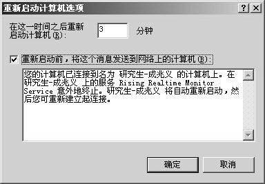 鼠标右键点击桌面上的“我的电脑”图标,选择“管理”,在弹出的“计算机管理”中找到“服务→Rising Realtime Monitor Service”,双击并切换到“故障恢复”选项卡(图1)。在“第一次失败”选择框中选择“重新启动计算机”,为了更加保险还可以在“第二次失败”和“后续失败”选择框中都选择“重新启动计算机”,最后点击下面的“重新启动计算机选项”进入设置窗体(图2)。这里可以设置系统自动重启前留给用户的剩余时间,为了及时保存数据,建议设成2分钟以上。勾选“重新启动前,将这个消息发送到网络上的计算机”选项,则计算机重新启动前就会发消息通知局域网中与你建立了连接的电脑。点“确定”后,瑞星的“病毒监控中心”也被“监控”起来了。