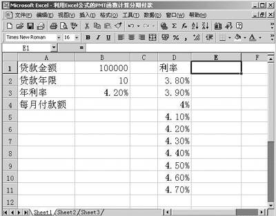 3.单击“确定”按钮,即可在E1单元格中得到年利率为4.2%条件下,分期付款每期应付的金额数。