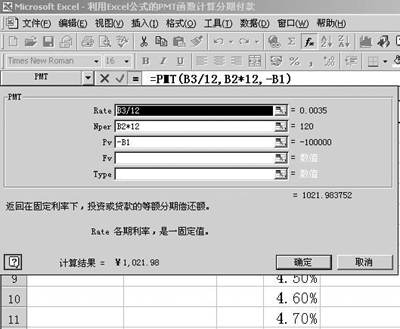 1.选定要输入公式的单元格E1,可以直接输入公式“=PMT(B3/12,B2*12,-B1)”,返回一个值1021.98,这个值就是用户每月的付款额,图1中的B4与E1单元格的输入公式相同,这一步也可以利用粘贴函数来输入函数;操作过程是:单击“常用”工具栏中的“粘贴函数”按钮,弹出“粘贴函数”对话框。在“函数分类”框中选择“财务”,在“函数名”列表框中选择“PMT”。
