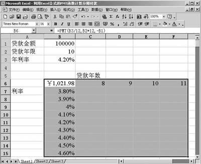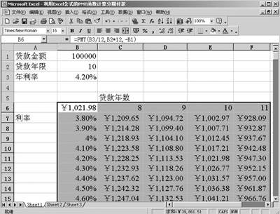 1.建立如图4所示的表格,在单元格B6中输入公式“=PMT(B3/12,B2*12,-B1)”,用户要注意的是不同的利率值输入在一列中,必须在PMT公式的正下方,不同年限输入在一行中,行输入项必须在公式的右侧。