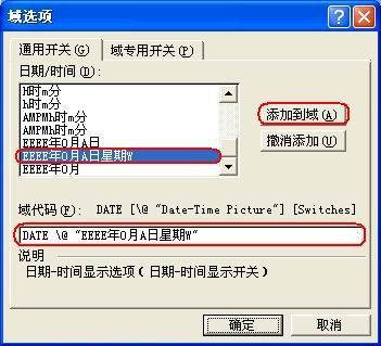 3.单击“选项”按钮,打开“域选项”对话框(图2),在“通用开关”标签下,选中一种日期样式,单击“添加到域”按钮,返回“域”对话框。