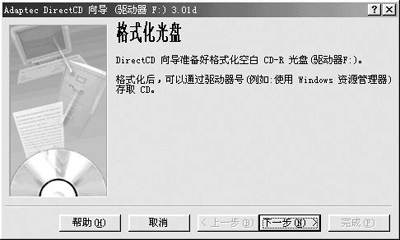 使用DirectCD时,任何一张新的CD-R/RW的盘片在使用前都需要格式化。用DirectCD3.01格式化盘片是比较简单的。将要格式化的盘片放入刻录机,系统自动检测,即出现DirectCD3.01向导画面(如图4)(如果系统没有自动检测画面出现,可以右击任务栏中的DirectCD3.01的图标,然后选择“格式化”项即可)。